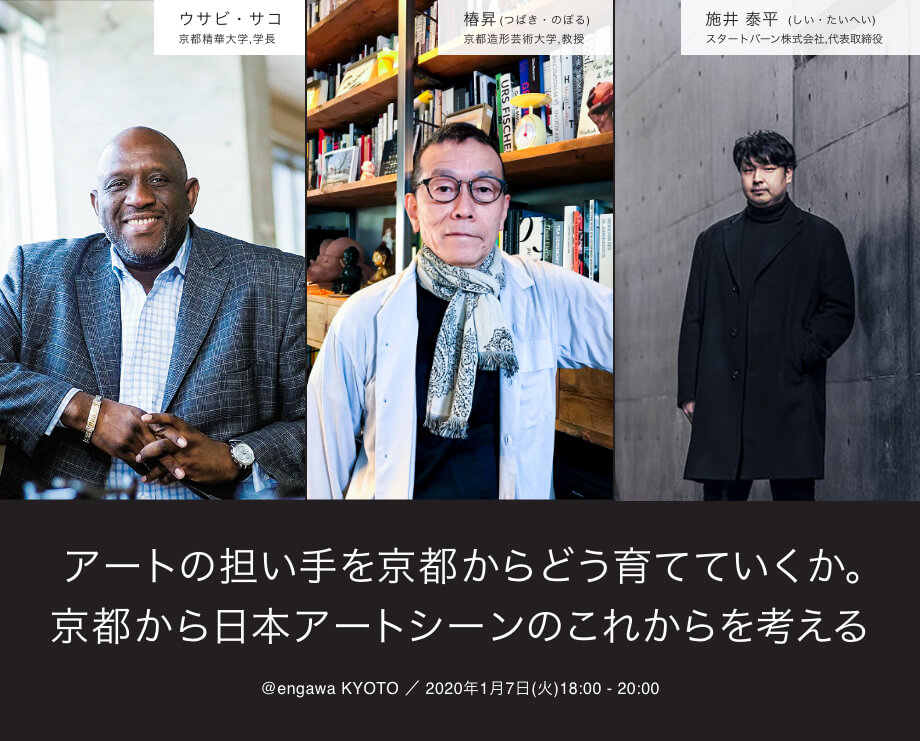 椿昇(京都造形芸術大学教授)氏、ウスビ・サコ(京都精華大学学長)氏、施井泰平(スタートバーン株式会社代表取締役)氏による、来たるべきアートの未来に向けてのトークイベントを行います。